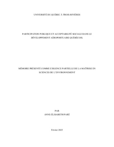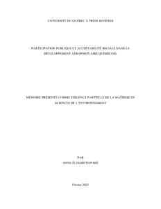 Paré, Anne-Élisabeth (2025). Participation publique et acceptabilité sociale dans le développement aéroportuaire québecois. Mémoire. Trois-Rivières, Université du Québec à Trois-Rivières, 157 p.