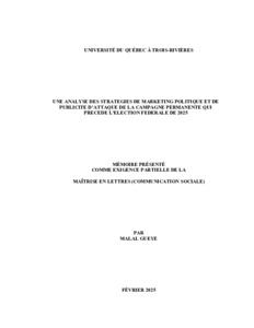 Gueye, Malal (2025). Une analyse des stratégies de marketing politique et de publicité d’attaque de la campagne permanente qui précède l'élection fédérale de 2025. Mémoire. Trois-Rivières, Université du Québec à Trois-Rivières, 113 p.