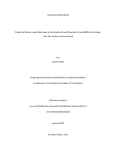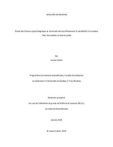 Fahmi, Imene (2025). Étude des facteurs psychologiques et socioculturels qui influencent la sensibilité à la douleur chez des adultes en bonne santé. Mémoire. Montréal; Trois-Rivières, Université de Montréal; Université du Québec à Trois-Rivières, 86 p.