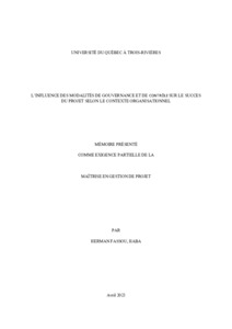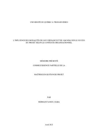 Haba, Herman Fassou (2023). L’influence des modalités de gouvernance et de contrôle sur le succès du projet selon le contexte organisationnel. Mémoire. Trois-Rivières, Université du Québec à Trois-Rivières, 103 p.