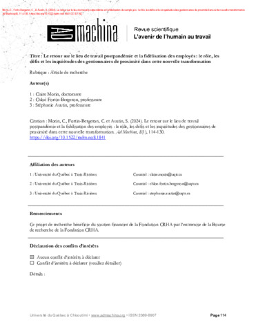 Morin, C., Fortin-Bergeron, C. et Austin, S. (2024). Le retour sur le lieu de travail postpandémie et la fidélisation des employés : le rôle, les défis et les inquiétudes des gestionnaires de proximité dans cette nouvelle transformation. Ad Machina (8). pp. 114-130. ISSN 2369-6907 DOI 10.1522/radm.no8.1841