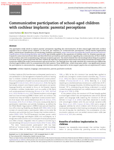 Duchesne, L., Gingras, M.-P. et Gagnon, M. (2025). Communicative participation of school-aged children with cochlear implants: Parental perceptions. The Journal of Deaf Studies and Deaf Education . enaf021. ISSN 1081-4159 DOI 10.1093/jdsade/enaf021