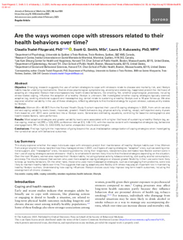 Trudel-Fitzgerald, C., Smith, S.G. et Kubzansky, L. D. (2025). Are the ways women cope with stressors related to their health behaviors over time? Annals of Behavioral Medicine, 59 (1). ISSN 0883-6612 DOI 10.1093/abm/kaaf006
