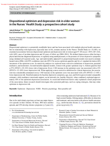 Weitzer, J., Trudel-Fitzgerald, C., Okereke, O. I., Kawachi, I. et Schernhammer, E. (2022). Dispositional optimism and depression risk in older women in the Nurses´ Health Study: A prospective cohort study. European Journal of Epidemiology, 37 (3). pp. 283-294. ISSN 1573-7284 DOI 10.1007/s10654-021-00837-2