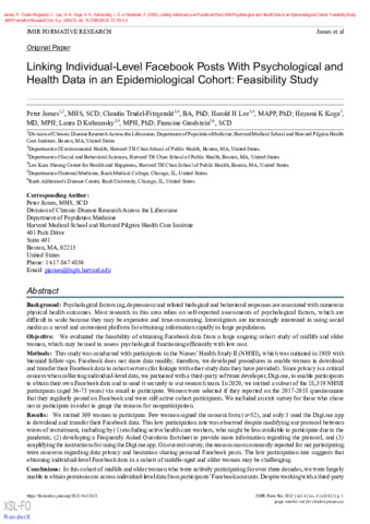 James, P., Trudel-Fitzgerald, C., Lee, H. H., Koga, H. K., Kubzansky, L. D. et Grodstein, F. (2022). Linking individual-level Facebook posts with psychological and health data in an epidemiological cohort: Feasibility study. JMIR Formative Research, 6 (4). e32423. ISSN 2561-326X DOI 10.2196/32423