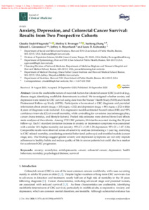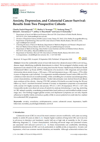 Trudel-Fitzgerald, C., Tworoger, S. S., Zhang, X., Giovannucci, E. L., Meyerhardt, J. A. et Kubzansky, L. D. (2020). Anxiety, depression, and colorectal cancer survival: Results from two prospective cohorts. Journal of Clinical Medicine, 9 (10). p. 3174. ISSN 2077-0383 DOI 10.3390/jcm9103174