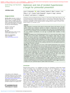 Kubzansky, L. D., Boehm, J. K., Allen, A. R., Vie, L. L., Ho, T. E., Trudel-Fitzgerald, C., Koga, H. K., Scheier, L. M. et Seligman, M. E. P. (2020). Optimism and risk of incident hypertension: A target for primordial prevention. Epidemiology and Psychiatric Sciences, 29 . ISSN 2045-7960 DOI 10.1017/S2045796020000621