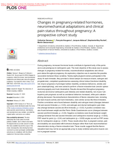 Daneau, C., Nougarou, F., Abboud, J., Ruchat, S.-M. et Descarreaux, M. (2025). Changes in pregnancy-related hormones, neuromechanical adaptations and clinical pain status throughout pregnancy: A prospective cohort study. PLOS ONE, 20 (2). Article e0314158. ISSN 1932-6203 DOI 10.1371/journal.pone.0314158