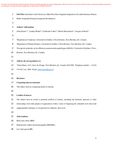 Ducas, J., Hamel, A., Vadez, G., Descarreaux, M. et Abboud, J. (2025). Individuals with chronic low back pain show impaired adaptations of lumbar extensor muscle reflex amplitude during unexpected perturbations. European Journal of Applied Physiology . ISSN 1439-6319 1439-6327 DOI 10.1007/s00421-025-05797-z