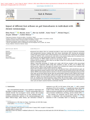 Payen, E., Acien, M., Isabelle, P.-L., Turcot, K., Begon, M., Abboud, J. et Moisan, G. (2025). Impact of different foot orthoses on gait biomechanics in individuals with chronic metatarsalgia. Gait & Posture, 118 . pp. 17-24. ISSN 0966-6362 1879-2219 DOI 10.1016/j.gaitpost.2025.01.022
