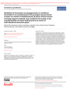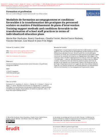Duchaine, M.-P., Gaudreau, N., Verret, C., Nadeau, M.-F., Bernier, V., Line, M. et Bégin, J.-Y. (2024). Modalités de formation-accompagnement et conditions favorables à la transformation des pratiques du personnel scolaire en matière d’établissement de plans d’intervention. Formation et profession, 32 (2). Article 875. ISSN 1718-8237 2368-9226 DOI 10.18162/fp.2024.875