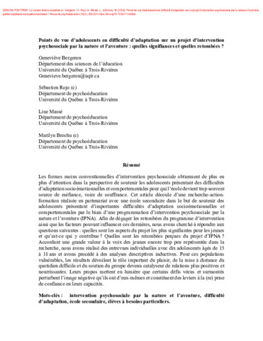 Bergeron, G., Rojo, S., Massé, L. et Brochu, M. (2024). Points de vue d’adolescents en difficulté d’adaptation sur un projet d’intervention psychosociale par la nature et l’aventure : quelles signifiances et quelles retombées ? Revue de psychoéducation, 53 (2). pp. 200-225. ISSN 1713-1782 DOI 10.7202/1114499ar
