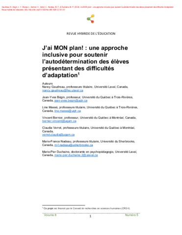 Gaudreau, N., Bégin, J.-Y., Massé, L., Bernier, V., Verret, C., Nadeau, M.-F. et Duchaine, M.-P. (2024). J’ai MON plan! : une approche inclusive pour soutenir l’autodétermination des élèves présentant des difficultés d’adaptation. Revue hybride de l'éducation, 8 (5). ISSN 2371-5669 DOI 10.1522/rhe.v8i5.1628