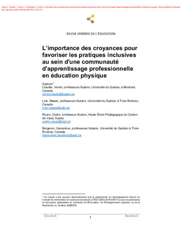 Verret, C., Massé, L., Roure, C. et Bergeron, G. (2024). L’importance des croyances pour favoriser les pratiques inclusives au sein d’une communauté d’apprentissage professionnelle en éducation physique. Revue hybride de l'éducation, 8 (5). ISSN 2371-5669 DOI 10.1522/rhe.v8i5.1623
