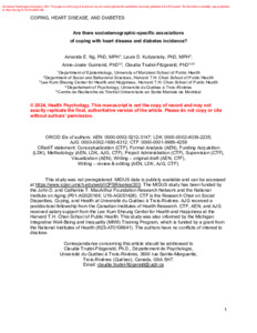 Ng, A. E., Kubzansky, L. D., Guimond, A.-J. et Trudel-Fitzgerald, C. (2024). Are there sociodemographic-specific associations of coping with heart disease and diabetes incidence? Health Psychology, 43 (10). pp. 757-767. ISSN 1930-7810 0278-6133 DOI 10.1037/hea0001386