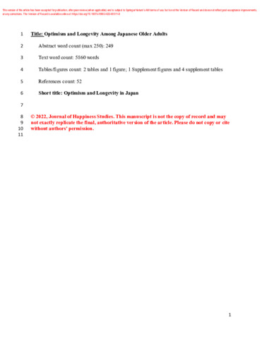 Okuzono, S. S., Shiba, K., Lee, H. H., Shirai, K., Koga, H. K., Kondo, N., Fujiwara, T., Kondo, K., Grodstein, F., Kubzansky, L. D. et Trudel-Fitzgerald, C. (2022). Optimism and Longevity Among Japanese Older Adults. Journal of Happiness Studies, 23 (6). pp. 2581-2595. ISSN 1573-7780 DOI 10.1007/s10902-022-00511-8