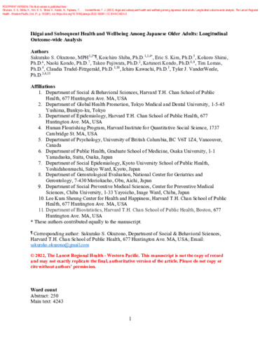 Okuzono, S. S., Shiba, K., Kim, E. S., Shirai, K., Kondo, N., Fujiwara, T., Kondo, K., Lomas, T., Trudel-Fitzgerald, C., Kawachi, I. et VanderWeele, T. J. (2022). Ikigai and subsequent health and wellbeing among Japanese older adults: Longitudinal outcome-wide analysis. The Lancet Regional Health - Western Pacific, 21 . p. 100391. ISSN 2666-6065 DOI 10.1016/j.lanwpc.2022.100391