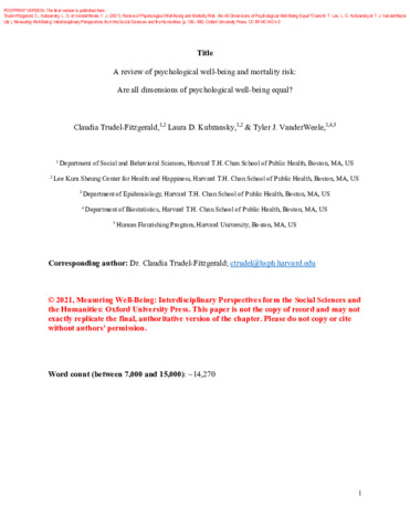 Trudel-Fitzgerald, C., Kubzansky, L. D. et VanderWeele, T. J. (2021). A Review of Psychological Well-Being and Mortality Risk: Are All Dimensions of Psychological Well-Being Equal? Dans : Lee, M. T. et Kubzansky, L. D. et VanderWeele, T. J., (eds.) Measuring Well-Being: Interdisciplinary Perspectives from the Social Sciences and the Humanities. Oxford University Press, 136–188. ISBN 9780197512531