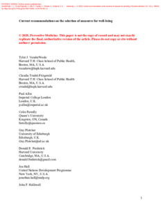 VanderWeele, T. J., Trudel-Fitzgerald, C., Allin, P., Farrelly, C., Fletcher, G., Frederick, D. E., Hall, J., Helliwell, J. F., Kim, E. S., Lauinger, W. A., Lee, M. T., Lyubomirsky, S., Margolis, S., McNeely, E., Messer, N., Tay, L., Viswanath, V., Węziak-Białowolska, D. et Kubzansky, L. D. (2020). Current recommendations on the selection of measures for well-being. Preventive Medicine, 133 . p. 106004. ISSN 0091-7435 DOI 10.1016/j.ypmed.2020.106004