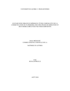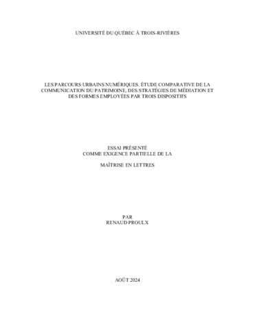 Proulx, Renaud (2024). Les parcours urbains numériques : étude comparative de la communication du patrimoine, des stratégies de médiation et des formes employées par trois dispositifs. Essai. Trois-Rivières, Université du Québec à Trois-Rivières, 50 p.