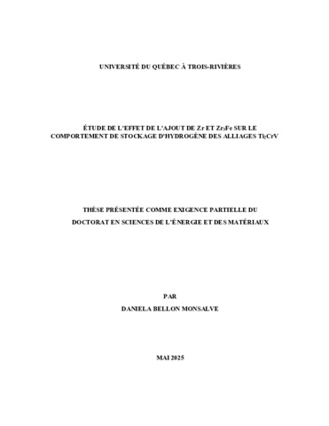 Bellon Monsalve, Daniela (2025). Étude de l'effet de l'ajout de Zr et Zr3Fe sur le comportement de stockage d'hydrogène des alliages Ti2CrV. Thèse. Trois-Rivières, Université du Québec à Trois-Rivières, 94 p.