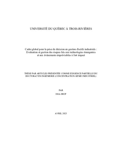 Diop, Issa (2025). Cadre global pour la prise de décision en gestion d'actifs industriels : évaluation et gestion des risques liés aux technologies émergentes et aux événements imprévisibles à fort impact. Thèse. Trois-Rivières, Université du Québec à Trois-Rivières, 279 p.