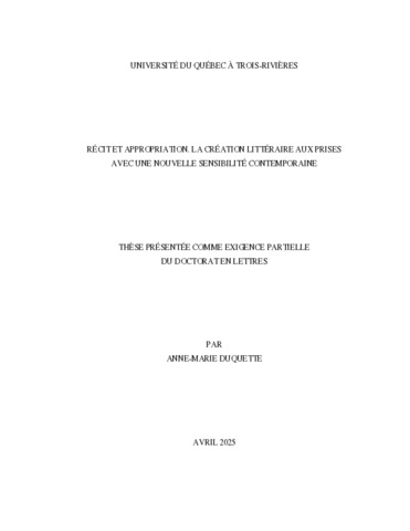 Duquette, Anne-Marie (2025). Récit et appropriation : la création littéraire aux prises avec une nouvelle sensibilité contemporaine. Thèse. Trois-Rivières, Université du Québec à Trois-Rivières, 355 p.