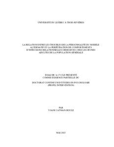 Catman-Houle, Yoani (2025). La relation entre les troubles de la personnalité du modèle alternatif et la perpétration de comportements d’intrusions relationnelles obsessives chez les jeunes adultes de la population générale. Essai. Trois-Rivières, Université du Québec à Trois-Rivières, 96 p.