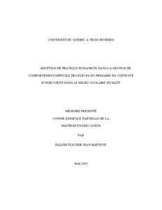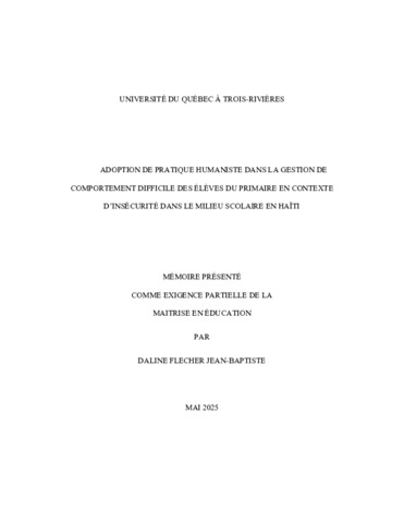 Flecher Jean-Baptiste, Daline (2025). Adoption de pratique humaniste dans la gestion de comportement difficile des élèves du primaire en contexte d’insécurité dans le milieu scolaire en Haïti. Mémoire. Trois-Rivières, Université du Québec à Trois-Rivières, 134 p.