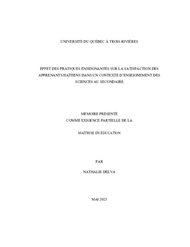 Delva, Nathalie (2025). Effet des pratiques enseignantes sur la satisfaction des apprenants haïtiens dans un contexte d’enseignement des sciences au secondaire. Mémoire. Trois-Rivières, Université du Québec à Trois-Rivères, 118 p.