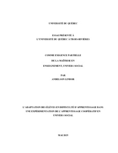 Lindor, Andelson (2025). L’adaptation des élèves en difficulté d’apprentissage dans une expérimentation de l’apprentissage coopératif en univers social. Essai. Trois-Rivières, Université du Québec à Trois-Rivières, 34 p.