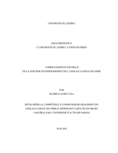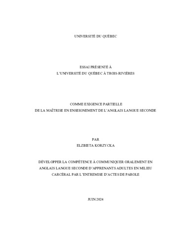 Korzycka, Elzbieta (2024). Développer la compétence à communiquer oralement en anglais langue seconde d’apprenants adultes en milieu carcéral par l’entremise d’actes de parole. Essai. Trois-Rivières, Université du Québec à Trois-Rivières, 100 p.