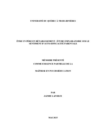 Laforce, Jaimie (2025). Être un père en rétablissement : étude exploratoire sur le sentiment d’auto-efficacité parentale. Mémoire. Trois-Rivières, Université du Québec à Trois-Rivières, 107 p.