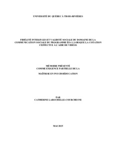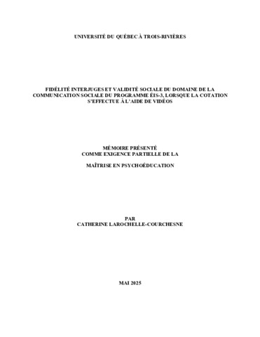 Larochelle-Courchesne, Catherine (2025). Fidélité interjuges et validité sociale du domaine de la communication sociale du programme ÉIS-3, lorsque la cotation s’effectue à l’aide de vidéos. Mémoire. Trois-Rivières, Université du Québec à Trois-Rivières, 146 p.