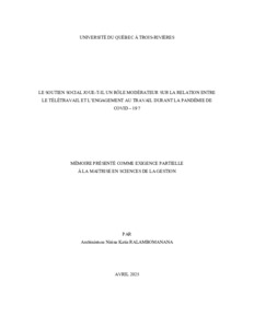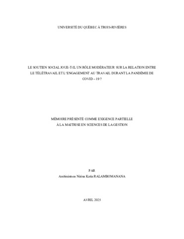 Ralambomanana, Ambinintsoa Nirina Katia (2025). Le soutien social joue-t-il un rôle modérateur sur la relation entre le télétravail et l’engagement au travail durant la pandémie de COVID-19? Mémoire. Trois-Rivières, Université du Québec à Trois-Rivières, 75 p.