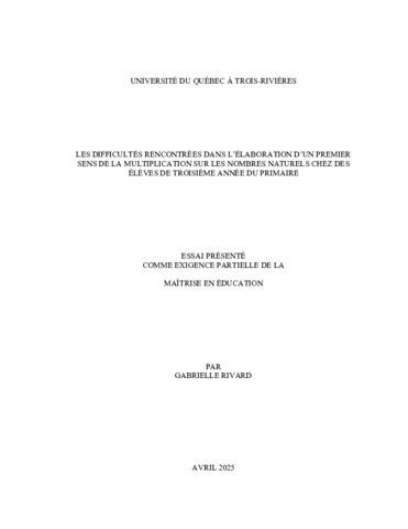 Rivard, Gabrielle (2025). Les difficultés rencontrées dans l’élaboration d’un premier sens de la multiplication sur les nombres naturels chez des élèves de troisième année du primaire. Essai. Trois-Rivières, Université du Québec à Trois-Rivières, 98 p.