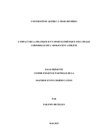 Decelles, Emy (2025). L’impact de la pratique d’un sport esthétique sur l’image corporelle de l’adolescent athlète. Essai. Trois-Rivières, Université du Québec à Trois-Rivières, 30 p.