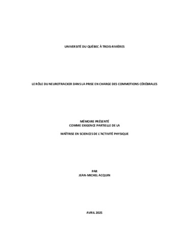 Acquin, Jean-Michel (2025). Le rôle du neurotracker dans la prise en charge des commotions cérébrales. Mémoire. Trois-Rivières, Université du Québec à Trois-Rivières, 124 p.