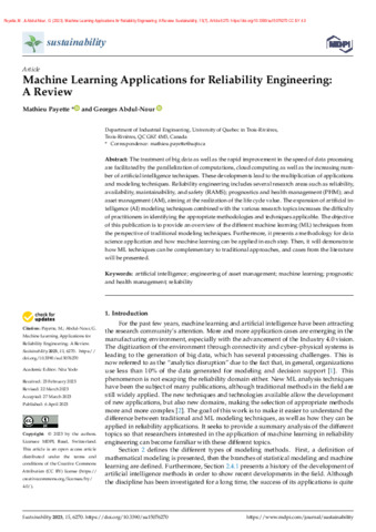 Payette, M. et Abdul-Nour, G. (2023). Machine learning applications for reliability engineering: A review. Sustainability, 15 (7). Article 6270. ISSN 2071-1050 DOI 10.3390/su15076270