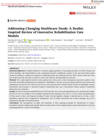 Giroux, C. M., Contandriopoulos, D., Bussières, A., Ahmed, S., Letts, L., Boruff, J., Starr, L. et Thomas, A. (2025). Addressing changing healthcare needs: A realist-inspired review of innovative rehabilitation care models. Journal of Evaluation in Clinical Practice, 31 (4). Article e70144. ISSN 1356-1294 1365-2753 DOI 10.1111/jep.70144