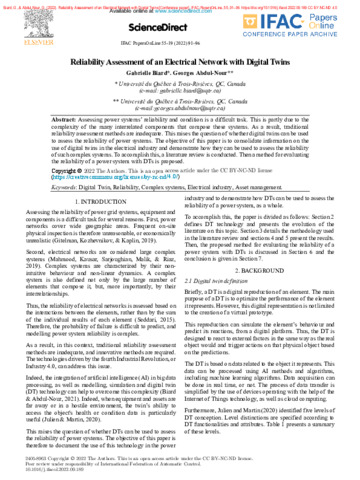 Biard, G. et Abdul-Nour, G. (2022). Reliability assessment of an electrical network with digital twins. Dans IFAC-PapersOnLine DOI 10.1016/j.ifacol.2022.09.189.