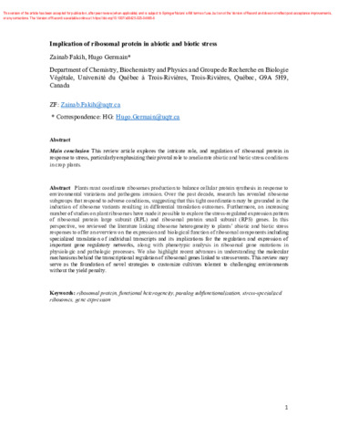 Fakih, Z. et Germain, H. (2025). Implication of ribosomal protein in abiotic and biotic stress. Planta, 261 (4). Article 85. ISSN 1432-2048 0032-0935 DOI 10.1007/s00425-025-04665-6