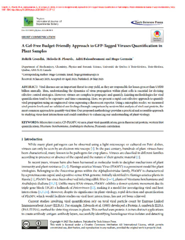 Grandhi, R., Plourde, M.-B., Balasubramani, A. et Germain, H. (2025). A Gel-Free Budget-Friendly Approach to GFP-Tagged Viruses Quantification in Plant Samples. Phyton-International Journal of Experimental Botany, 94 (5). pp. 1497-1504. ISSN 0031-9457 1851-5657 DOI 10.32604/phyton.2025.063974