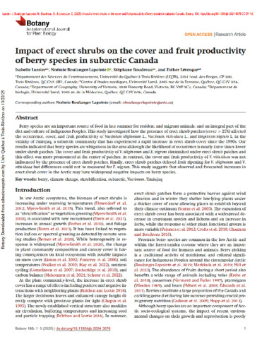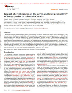 Lussier, I., Boulanger-Lapointe, N., Boudreau, S. et Lévesque, E. (2025). Impact of erect shrubs on the cover and fruit productivity of berry species in subarctic Canada. Botany, 103 . ISSN 1916-2790 1916-2804 DOI 10.1139/cjb-2024-0076