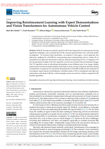 Elallid, B. B., Benamar, N., Bagaa, M., Kelouwani, S. et Mrani, N. (2024). Improving Reinforcement Learning with Expert Demonstrations and Vision Transformers for Autonomous Vehicle Control. World Electric Vehicle Journal, 15 (12). p. 585. ISSN 2032-6653 DOI 10.3390/wevj15120585