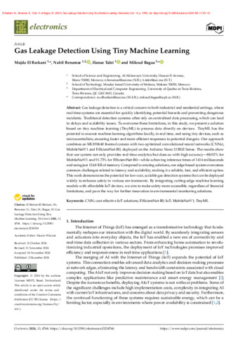 El Barkani, M., Benamar, N., Talei, H. et Bagaa, M. (2024). Gas Leakage Detection Using Tiny Machine Learning. Electronics, 13 (23). p. 4768. ISSN 2079-9292 DOI 10.3390/electronics13234768