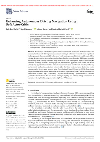 Elallid, B. B., Benamar, N., Bagaa, M. et Hadjadj-Aoul, Y. (2024). Enhancing Autonomous Driving Navigation Using Soft Actor-Critic. Future Internet, 16 (7). p. 238. ISSN 1999-5903 DOI 10.3390/fi16070238