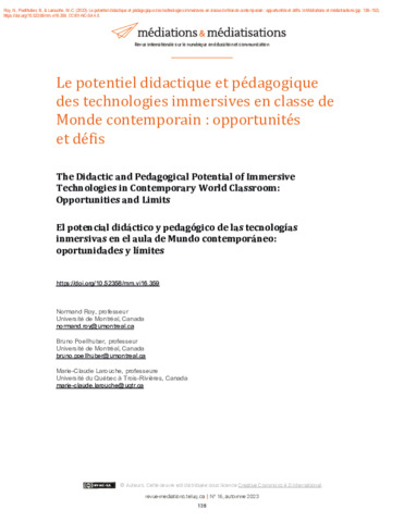 Roy, N., Poellhuber, B. et Larouche, M.-C. (2023). Le potentiel didactique et pédagogique des technologies immersives en classe de Monde contemporain : opportunités et défis. Médiations et médiatisations (16). pp. 138-152. ISSN 2562-0630 DOI 10.52358/mm.vi16.359