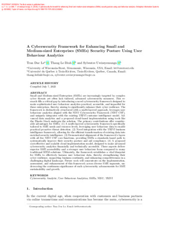 Le, T. D., Le Dinh, T. et Uwizeyemungu, S. (2025). A cybersecurity framework for enhancing Small and medium-sized enterprises (SMEs) security posture using user behaviour analytics. Enterprise Information Systems . p. 2529282. ISSN 1751-7575 DOI 10.1080/17517575.2025.2529282