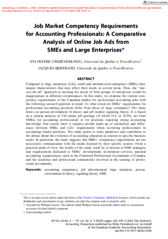 Uwizeyemungu, S. et Bertrand, J. (2025). Job Market Competency Requirements for Accounting Professionals: A Comparative Analysis of Online Job Ads from SMEs and Large Enterprises. Accounting Perspectives, 24 (2). pp. 343-391. ISSN 1911-382X DOI 10.1111/1911-3838.12396